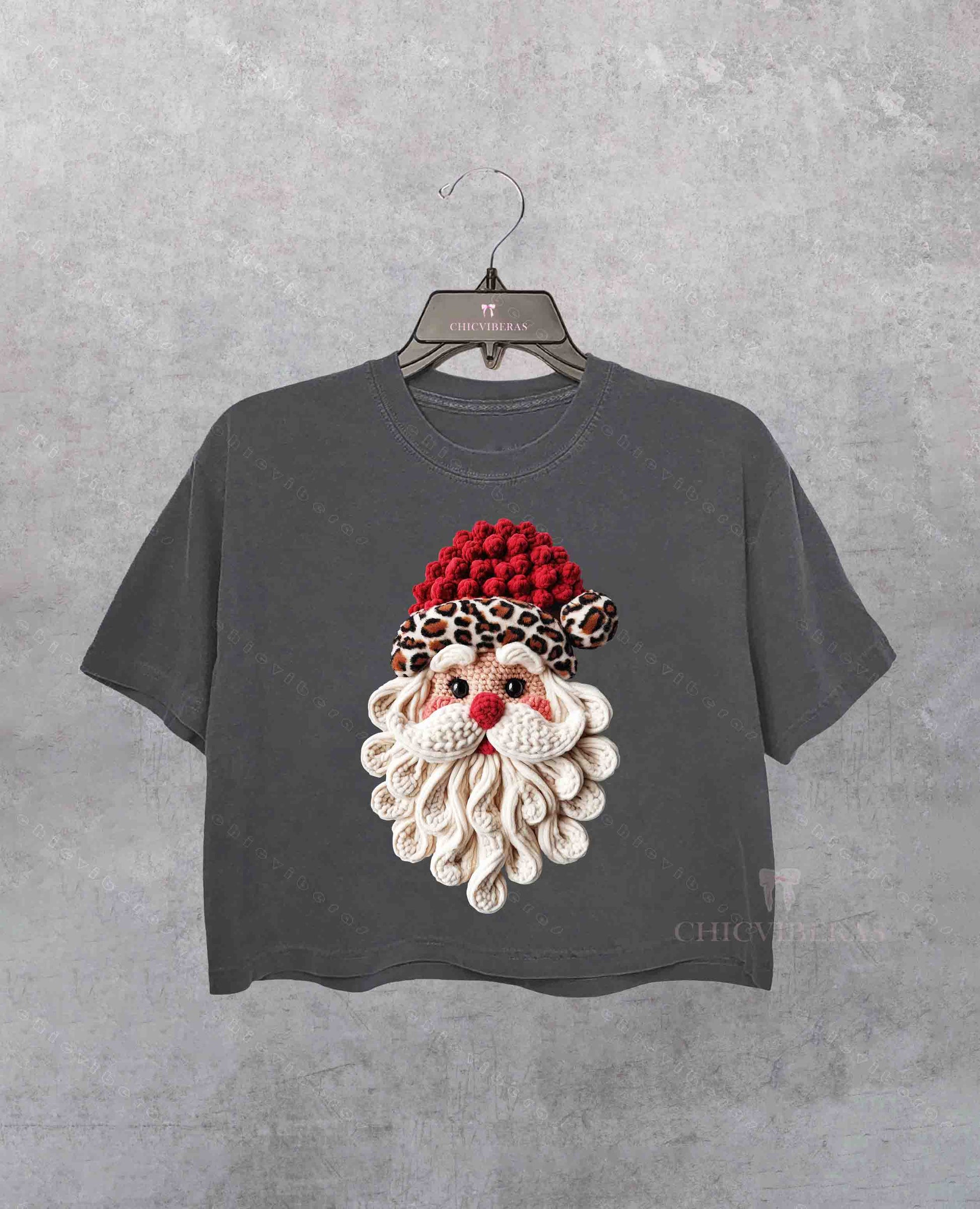 Trendy Faux Pink Yarn Crochet Santa Crop Shirt